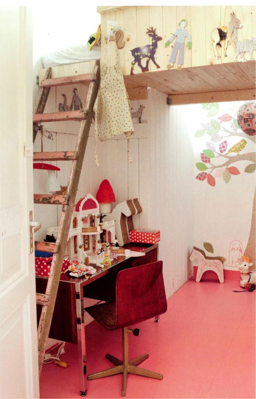 En esta última foto de uno de los cuartos de los niños, me encanta la cama alta y el árbol de Inke, sus “papeles pintados” son de mis favoritos.