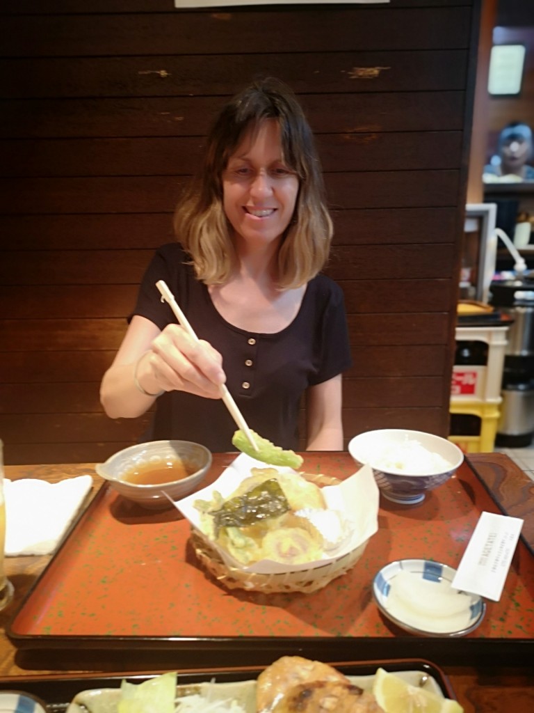 Maravilla que siempre recordaremos fue la vuelta pedaleando mientras anochecía y la llegada a nuestra casa, el templo. Fuimos a cenar a una izakaya cerquita que fue de las cenas más especiales. Sentados en el suelo, en el tatami, yo me tomé una tempura… de escándalo. (la izakaya era una de las recomendaciones que te dan las personas que llevan el shukubo, no conservé el mapa, pero si vais os darán varios lugares y serán todos estupendos seguro).